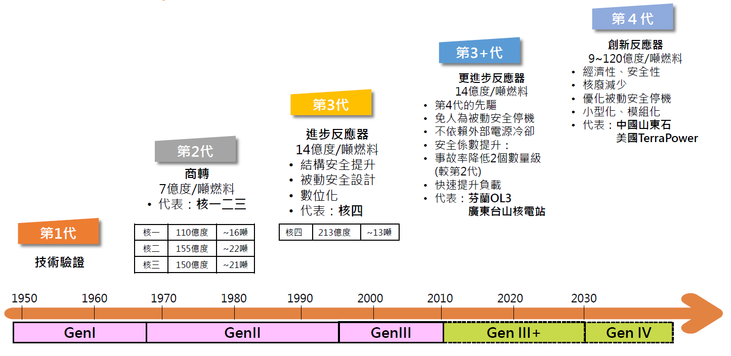 - 全球當前操作或建造中的核反應器多屬於第2代或第3代技術,後者相較於前者已有顯著的進步,如數位化控制與被動安全系統,我國原規劃興建的核四亦屬於第3代,每噸燃料約可產生14億度電。相對於第2代,第3代核能除了單位燃料產電量提高之外,亦將控制系統進行數位化,對反應爐結構與事故停機的因應機制已加以改良。