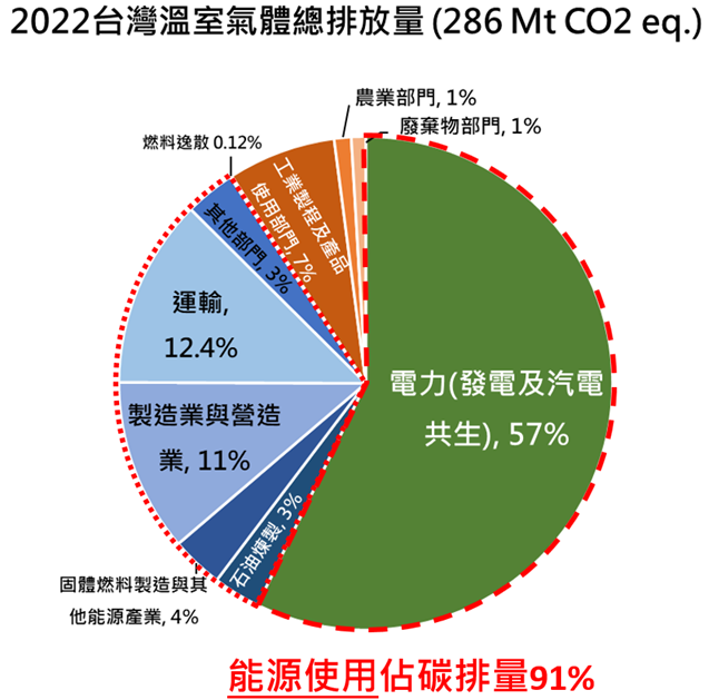 能源使用可進一步分為電力使用(綠色填滿區塊)與非電力能源使用(藍色系填滿區塊),兩者的占比分別為 57% 和 34%。在非電力能源使用中,運輸業占比最大,達12.4%,其次為製造業與營造業,合計占比為 11%。至於非能源用途所產生的碳排放,工業製程與產品使用占 7%,農業與廢棄物部門則各占 1%。