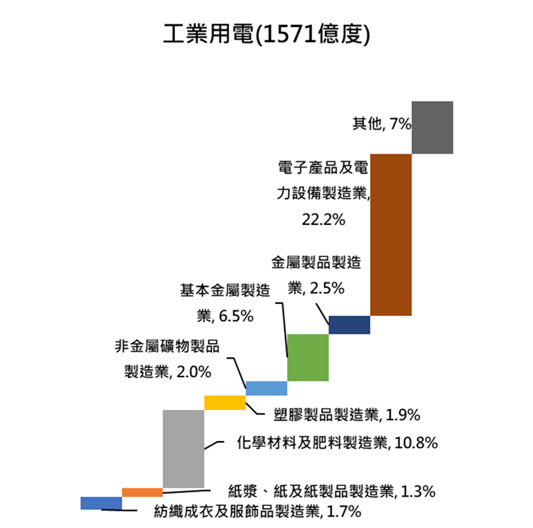 圖3顯示工業用電(1571億度)的結構分布,資料來源為能源署發布的能源統計手冊2。其中,電子產品及電力設備製造業是工業用電的最大消耗者,占比達22.2%,顯示其在工業發展中的主導地位。其次為化學材料及肥料製造業,用電占比為10.8%,緊隨其後的是基本金屬製造業,占6.5%。金屬製品製造業與非金屬礦物製品製造業的用電比例分別為2.5%與2.0%,而塑膠製品製造業占1.9%。紡織成衣及服飾品製造業與紙漿、紙及紙製品製造業分別占1.7%與1.3%。這些數據不僅展示了各行業的用電差異,也反映了電子產品及化學材料相關產業對工業用電需求的顯著影響。