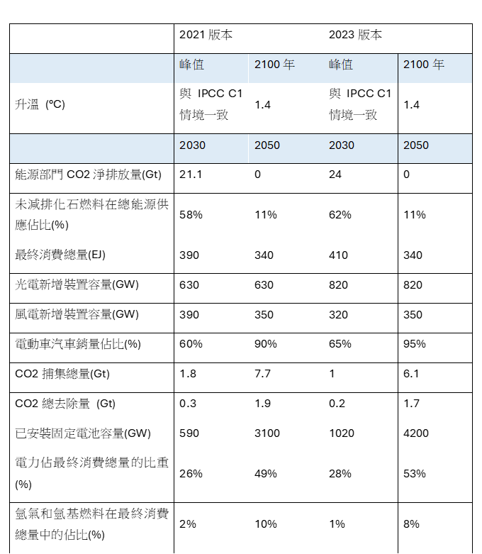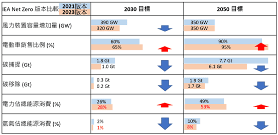 圖3 IEA淨零路徑2021/2023版本比較──風力、電動車、氫能與碳捕捉的預估調整