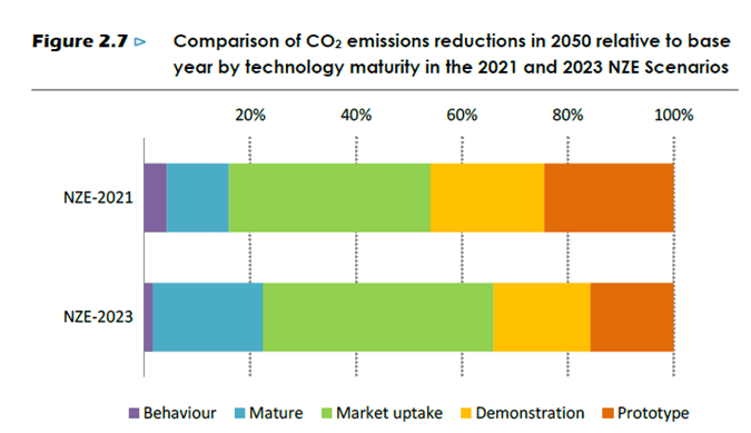 與 2021 版相比,2023 版NZE 場景更依賴市場接受度較高的技術,包括已經成熟並具備商業化條件的解決方案,如電氣化、再生能源與能源效率提升。此外,行為改變(behavioral change) 也在 2023 版中占據更重要的地位,例如消費模式轉變、能源使用習慣的優化等,成為減排的關鍵貢獻因素。2021 版中,約50%的減排來自仍處於示範(demonstration)或原型(prototype)階段的技術,而在 2023 版 NZE 場景中,這一比例已下降至 約 35%。這表明新技術的發展與應用進度低於最初預期,IEA 在 2023 版報告中調整了減排來源的假設。這顯示 2023 版認為 2050 年的減排策略將更多依賴現有技術的擴展與應用,而尚未成熟的創新技術突破貢獻度調降。