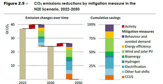 在2022至2050年的NZE(淨零排放)情境下,各種減排措施將共同推動全球碳排放的下降,各減緩措施所帶來的二氧化碳減量貢獻,如下圖所示。