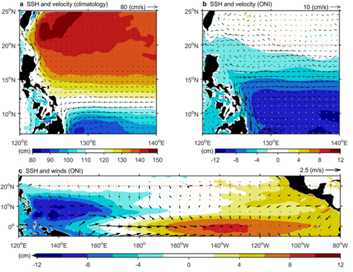 顏色會在圖a為長期平均海表面高度、在圖b-c為聖嬰期間的海表面高度異常值。箭頭在圖a為長期平均海表面流速、在圖b為聖嬰期間的海表面流速異常值、在圖c為聖嬰期間的表面風速異常值。