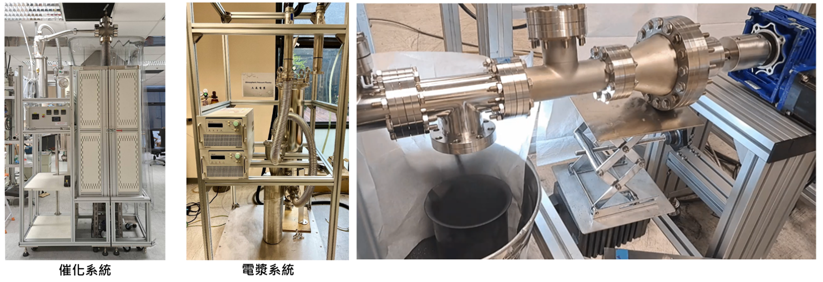• 本院研究團隊已完成建置催化裂解及電漿裂解兩套機型,以及固態碳收集系統(小規模)。