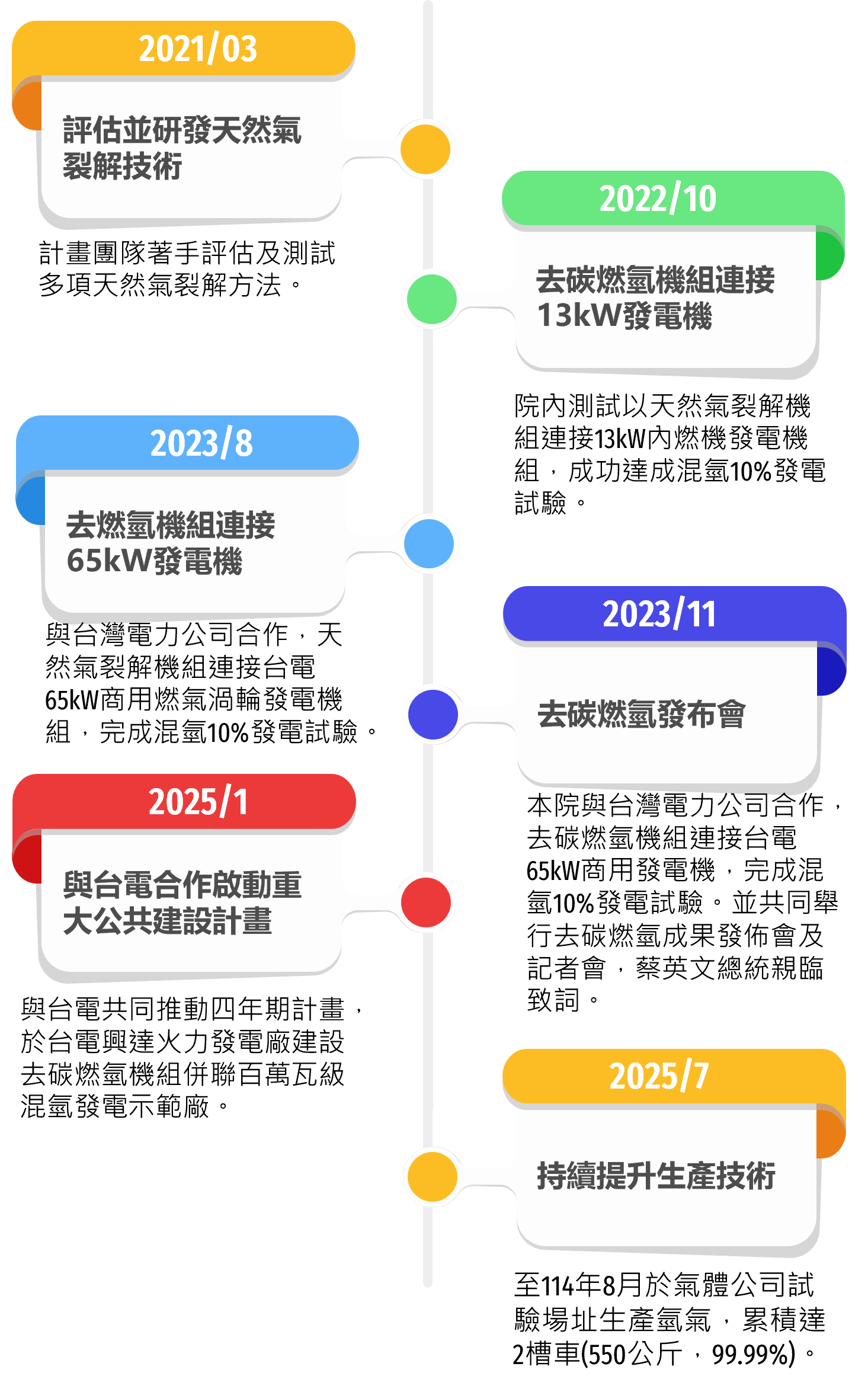 • 本院研究團隊與台電合作,規劃於四年期間將去碳製氫機組串接MW級燃氣發電機組,混氫至少20%發電試驗,以落實去碳燃氫技術實用化。