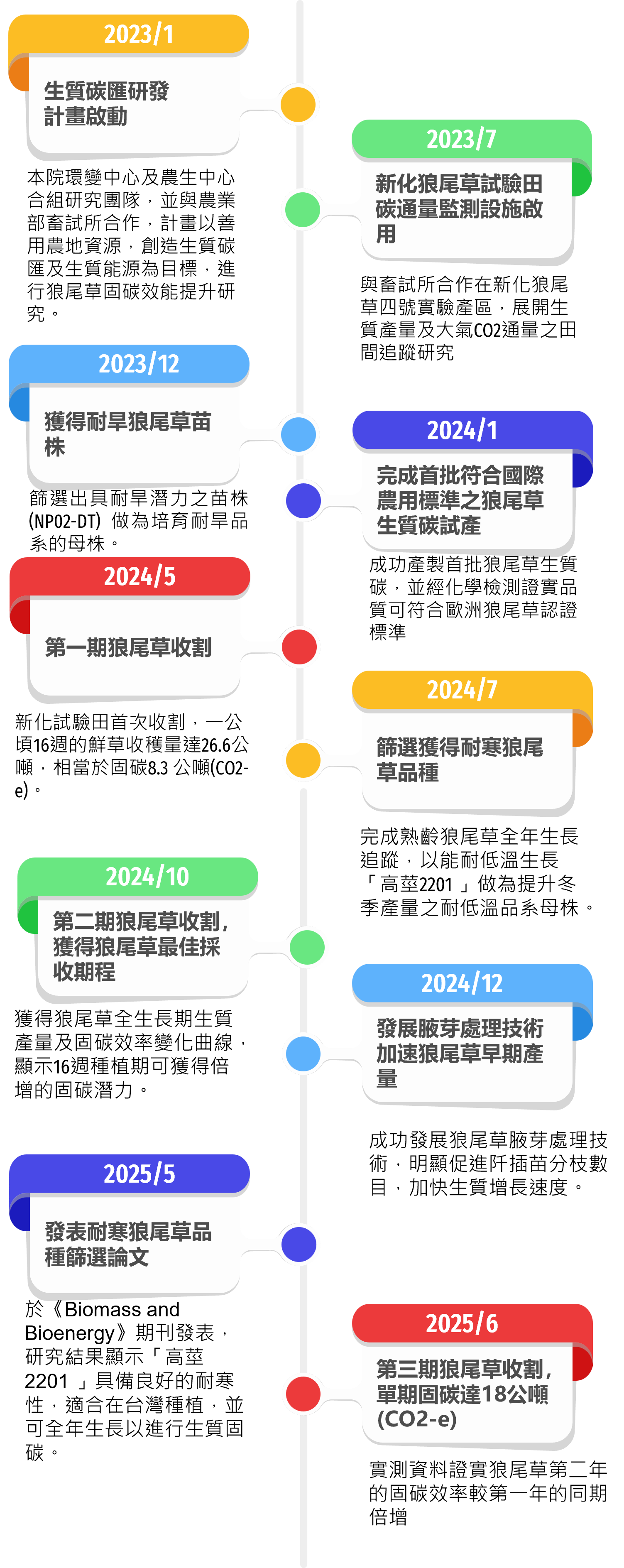 - 本院研究團隊已完成選定高固碳效率之狼尾草品種(CV4),後續將進行耐旱性、耐寒性等環境逆境進行試驗。