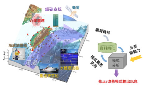 因觀測資料畢竟有其時間與空間之侷限,本院海洋能研發計畫亦同步發展高精度海洋資料同化數值模式,目的在模擬台灣東部海域長期態勢,並透過模式,可探討黑潮發電機的最佳排列方式,及其與小尺度紊流的相互作用和所致的環境影響,結合長期觀測資料、海洋地質條件及高精度資料同化數值模式等資訊,評估優選發電區位。 - 黑潮渦輪發電機研發