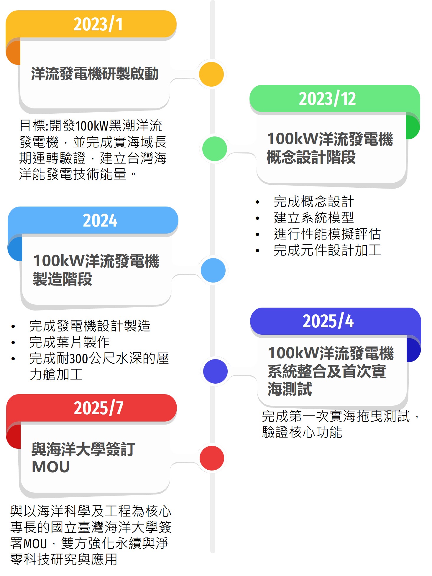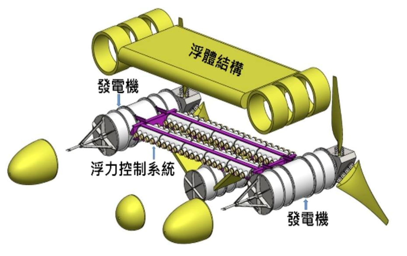 - 研發製作100 kW浮游式黑潮發電機,並進行相關測試
