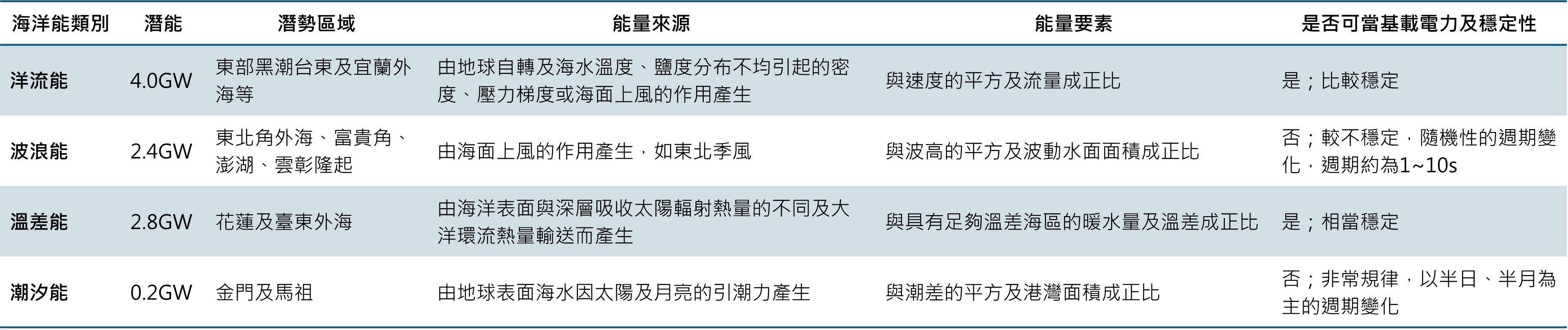 這四種海洋能的特性,分別為:洋流能是利用流速穩定的海流來驅動渦輪發電,如台灣東部穩定且流量大的「黑潮」,適合開發作為基載電力使用;波浪能是利用海洋表面的波浪運動來產生能源,如東北角外海及澎湖外海直接受東北季風影響,適合發展波浪能;溫差能是利用表層溫暖的海水與深層冷海水的溫差進行能量轉換來發電,東部海域有較理想的溫差條件,適合發展;潮汐能是利用海水因潮汐運動而形成的水位差或流速來發電,然而台灣潮差較不明顯,故潮汐能潛力較低[2]。每種海洋能發電的特性、適合的區域、季節與穩定性,以及最重要的發電潛能,都有所不同。以下為台灣海洋能潛能及對應區域[3,4]。